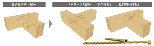 さらにパネリードXはほぞの代用だけではなく、実はあのゴツい「羽子板ボルト」の代用もできるのです!