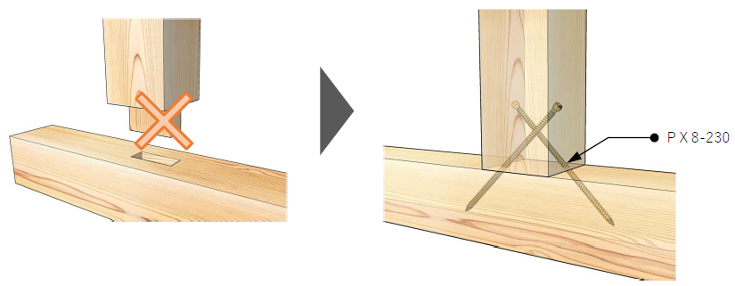 ほぞがない「突き付け」の状態でも、パネリードXを斜めに2本打ち込むことで、本来ほぞが担うはずだった「せん断耐力」を確保できます。