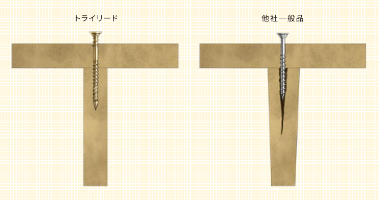 トライリード用に新開発された形状が木材をしっかり削り、さらに削り出した木くずを効果的に排出することで、 これまでにない高い木割れ防止効果を発揮し、頭浮きせず材同士をしっかりと締結します。